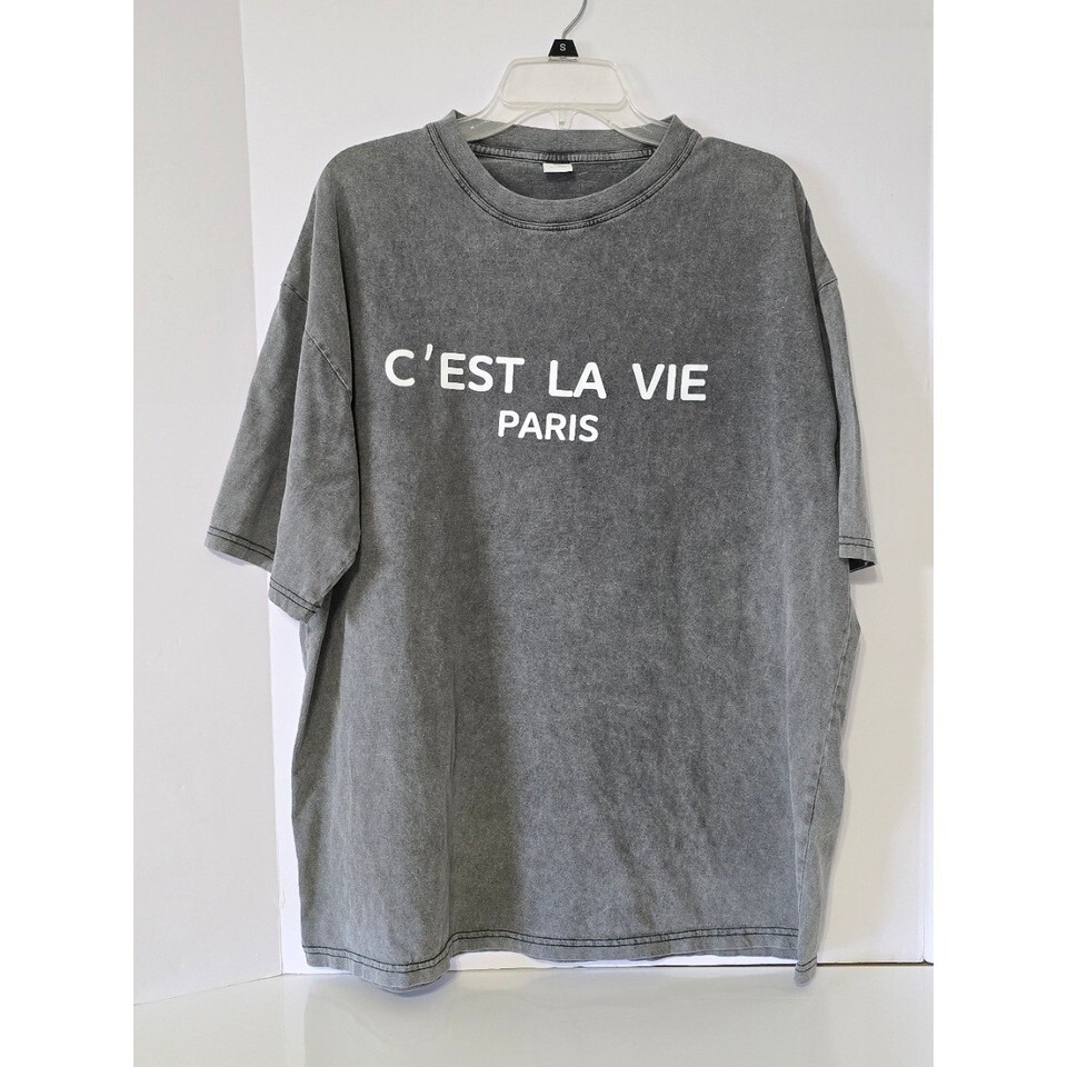 Keywords: oversized graphic t shirt, C'est La Vie Paris tee, washed gray t shirt, women's graphic tee, Paris graphic shirt, cotton blend t shirt, casual t shirt, streetwear t shirt, everyday top, relaxed fit tee, statement t shirt, French phrase shirt