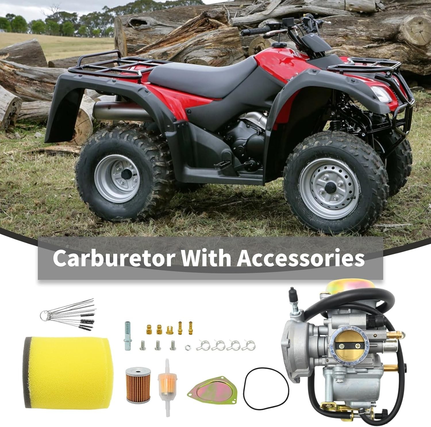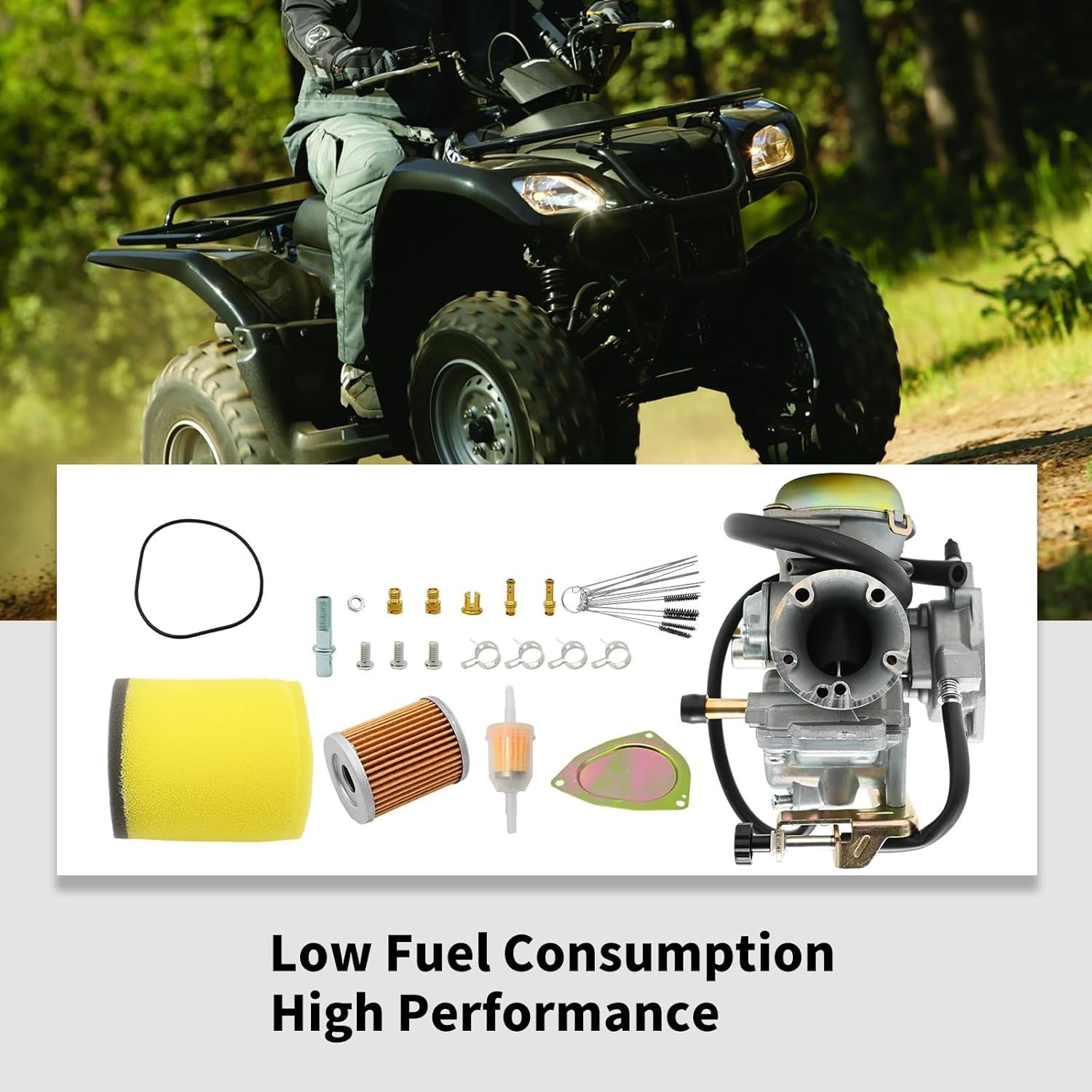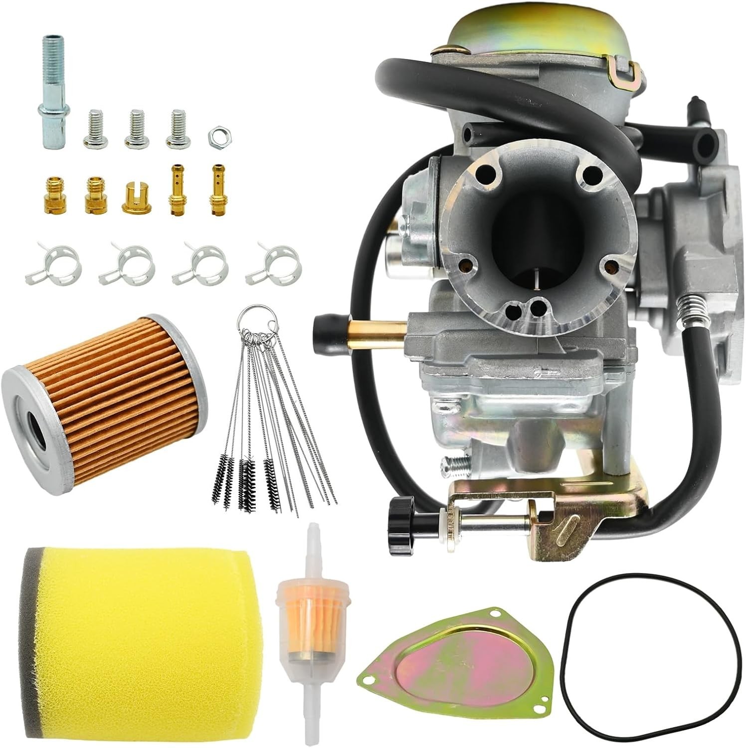 [Replace Part Number]: 13200-21G10, 13200-05G22, 13200-05G00, 13200-05G11, 13200-05G10. [Fitment]: Ozark 250 carburetor replacement for Suzuki LT-F250 Ozark 2002-2009, 2012-2014, LT-Z250 QuadSport Z 2004-2009. [Package Includes]: 1 x carburetor, 1 x air cleaner, 1 x oil filter and other accessories as shown in the picture. [Part Parameters]: Inner Diameter (intake side): 28mm, Outer Diameter (intake side):37mm, Inner Diameter (air filter side):48mm, Outer Diameter(air filter side): 52mm. [Improve performance]: Carburetor can solve the problems of internal rust, component damage, lack of power, insufficient fuel combustion, etc. It can be adapted to different environmental conditions and driving needs, provide the right fuel mixing ratio, and improve combustion efficiency and engine performance.
