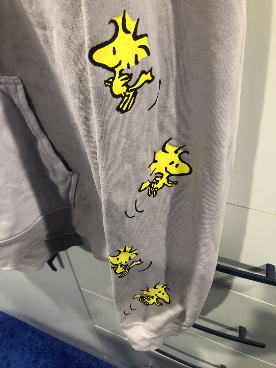 PEANUTS GIRLS GRAY PULLOVER HOODIE WITH SNOOPY AND WOODSTOCK (XL). SNOOPY AND WOODSTOCK ON FRONT WITH FOUR WOODSTOCKS ALONG LEFT SLEEVE. COMES FROM SMOKE FREE HOME WITH FREE SHIPPING. 60% COTTON 40% POLYESTER. MACHINE WASH COLD. MADE IN CHINA.