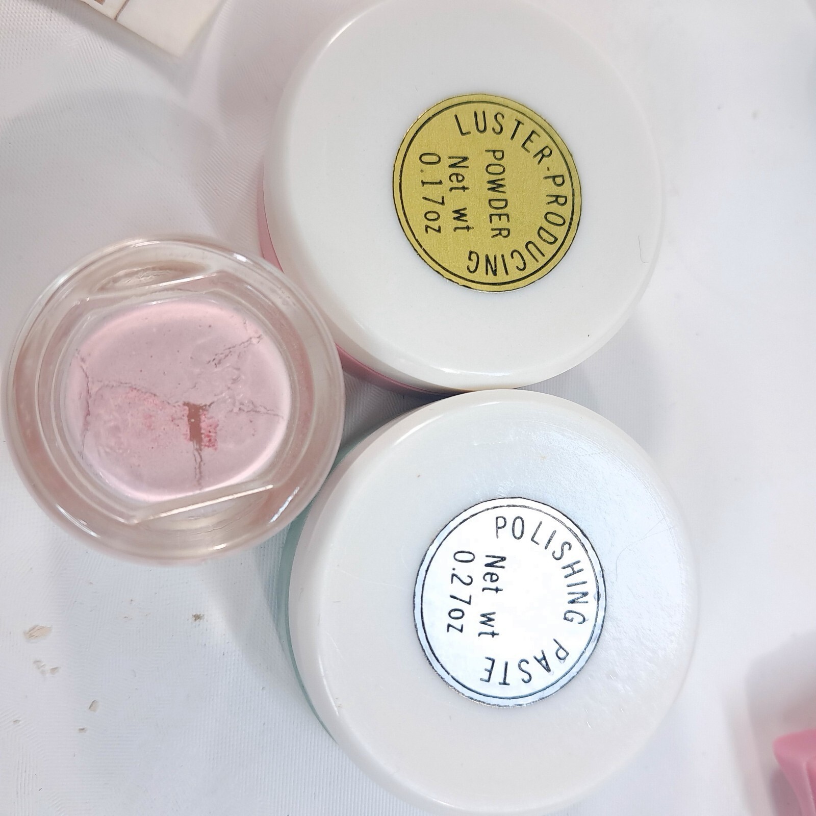 Powder, nail care conditioning cream, Paste, pink buffer, wiper. Used set. Nail cream is cracked and about half full. See pics for condition/details.