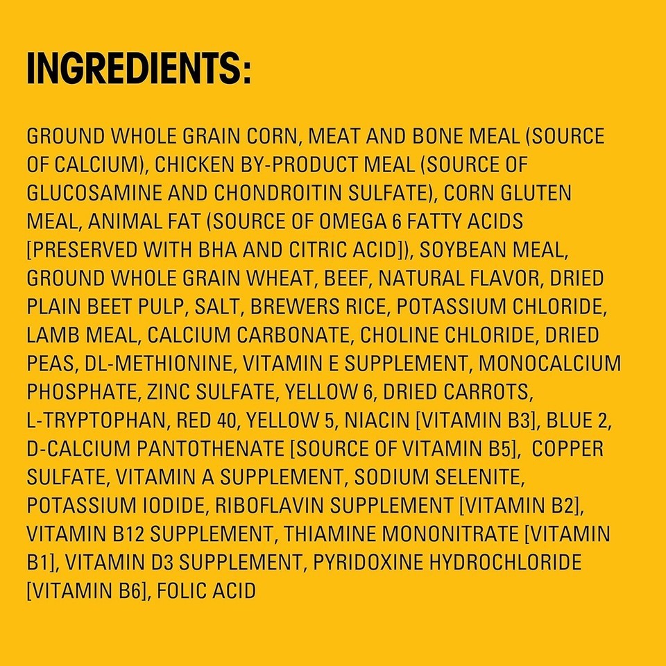 Ground Whole Grain Corn, Meat and Bone Meal (source of Calcium), Chicken by-Product Meal (source of Glucosamine and Chondroitin Sulfate), Corn Gluten Meal, Animal Fat (source of Omega 6 Fatty Acids [preserved with BHA and Citric Acid]), Soybean Meal, Ground Whole Grain Wheat, Beef, Natural Flavor, Dried Plain Beet Pulp, Salt, Brewers Rice, Potassium Chloride, Lamb Meal, Calcium Carbonate, Choline Chloride, Dried Peas, DL-Methionine, Vitamin E Supplement, Monocalcium Phosphate, Zinc Sulfate, Yellow 6, Dried Carrots, L-Tryptophan, Red 40, Yellow 5, Niacin [Vitamin B3], Blue 2, D-Calcium Pantothenate [source of Vitamin B5], Copper Sulfate, Vitamin A Supplement, Sodium Selenite, Potassium Iodide, Riboflavin Supplement [Vitamin B2], Vitamin B12 Supplement, Thiamine Mononitrate [Vitamin B1], Vitamin D3 Supplement, Pyridoxine Hydrochloride [Vitamin B6], Folic Acid