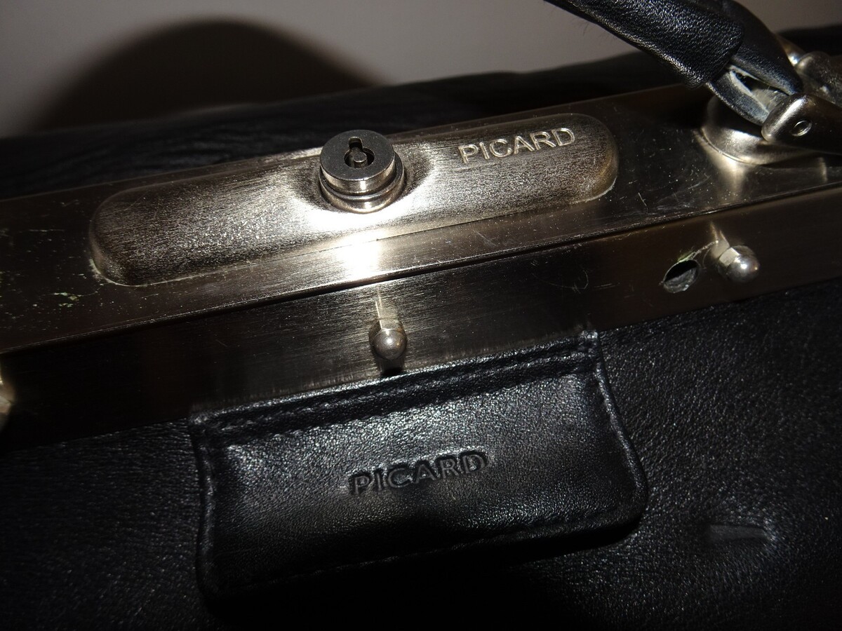 This is a pre-owned PICARD leather doctor-style travel bag featuring a heavy-duty metal frame and wide opening design. The bag includes the original detachable shoulder strap and two keys.