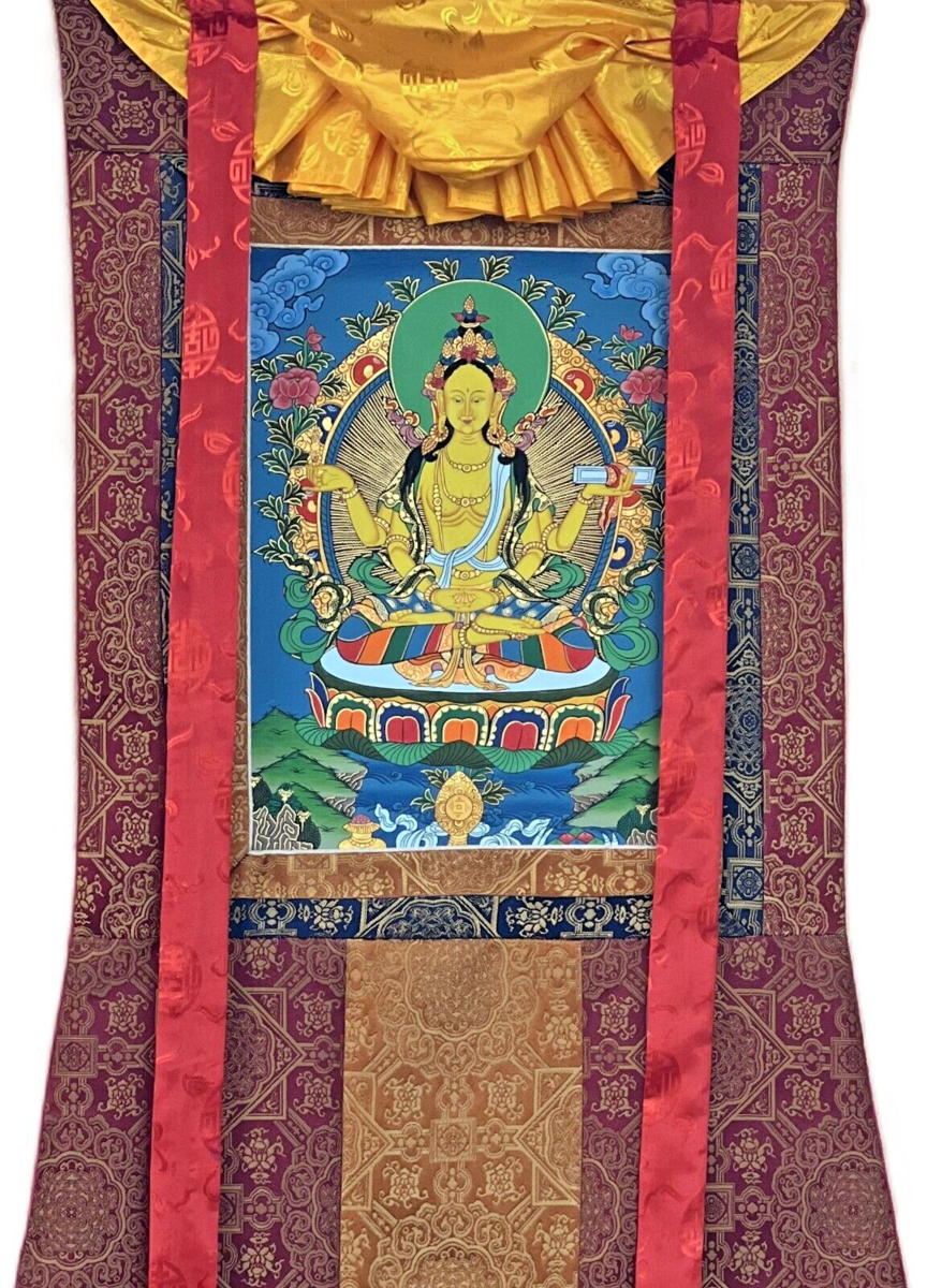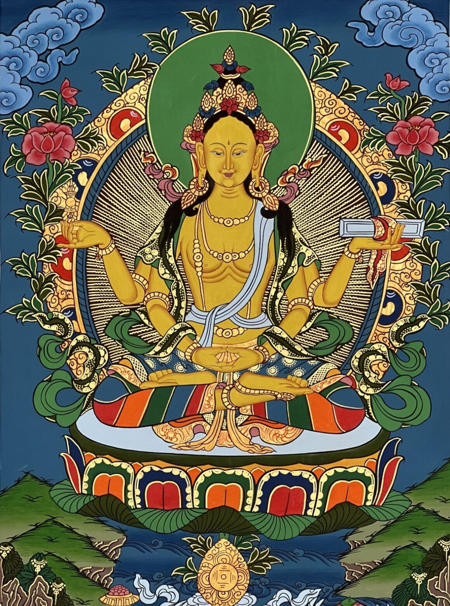 This is an original hand-painted Tibetan Thangka Painting of Prajnaparamita, an important concept in Mahayana Buddhism. It is bordered with high-quality silk and depicts wisdom that leads to realizing emptiness (shunyata) and the true nature of reality.