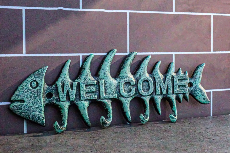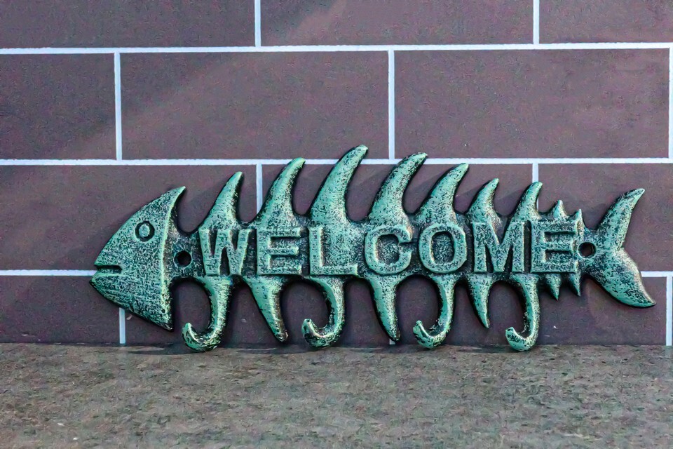 ? Introducing the Fishbone Quadruple Wall Hook And Welcome Sign- the ultimate solution for organizing your space with style and functionality! This innovative wall hook features a sleek fishbone design, adding a touch of elegance to any room. We words Welcome is etched onto the spine of the fish. Crafted from premium cast iron, it ensures long-lasting performance. Whether you need to hang coats, hats, bags, or even keys, the Fishbone Quadruple Wall Hook has got you covered.