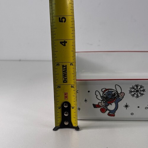 This ceramic casserole dish features a festive design of Stitch wearing a Santa hat, perfect for a Christmas-themed meal. Measuring 9 inches in length and width, it is decorated in a multicolor painted finish, adding a touch of Disney magic to your dining table. This collectible item is branded with Stitch's name and is themed around the beloved Disney character, making it a charming addition to any fan's collection. The dish is designed for both practical use and as a decorative piece, showcasing Stitch in a cheerful