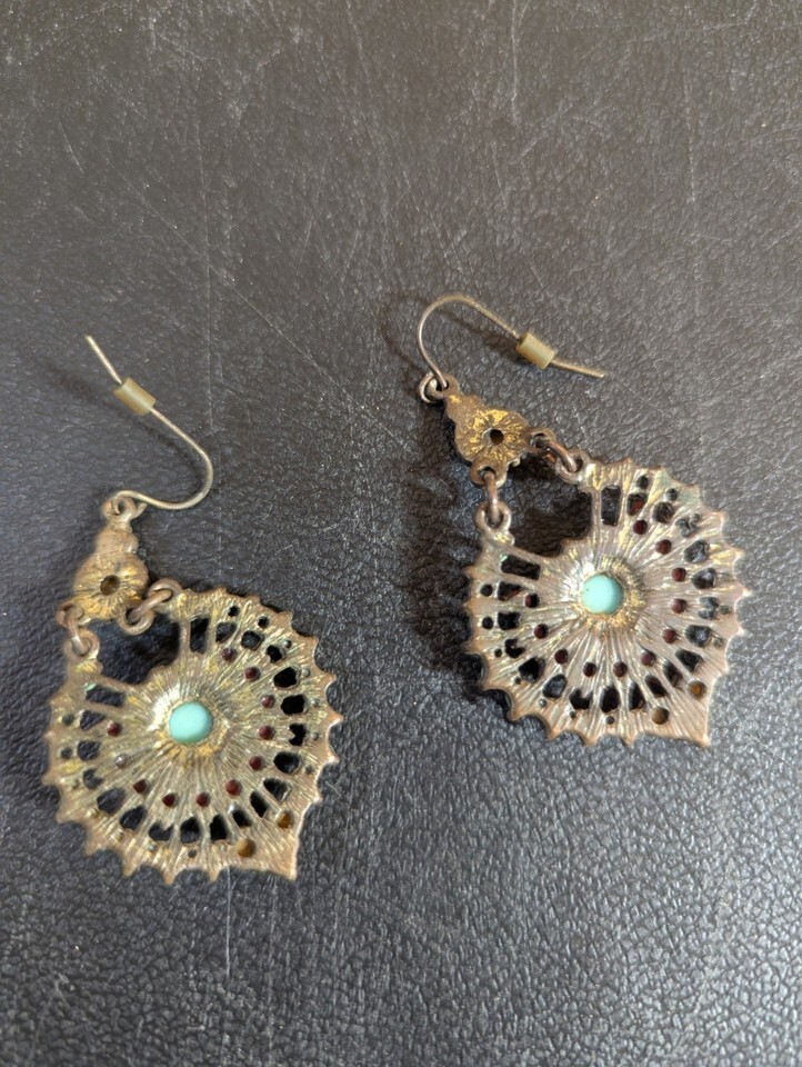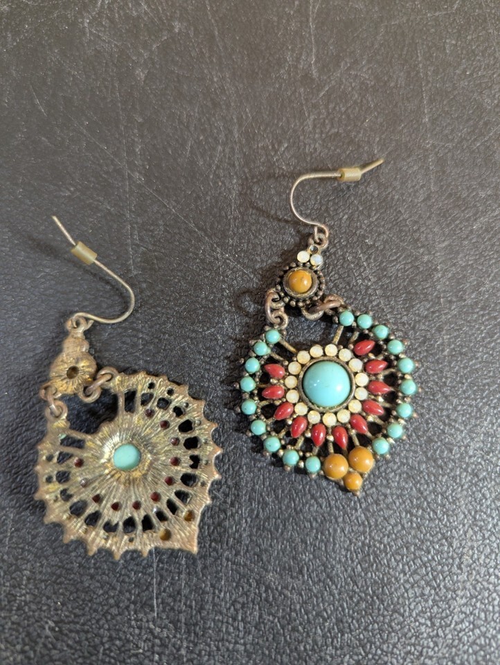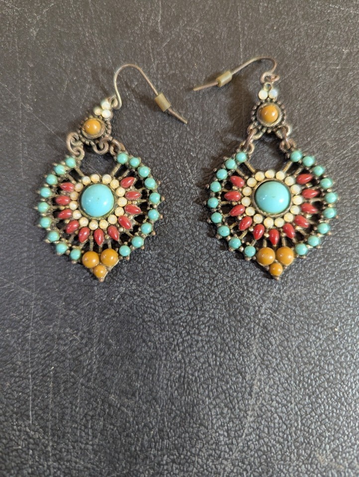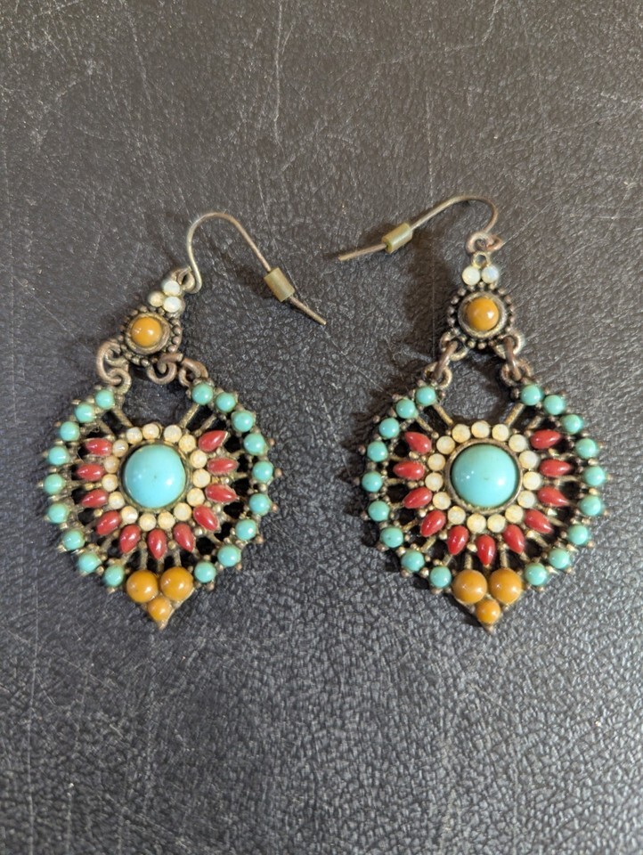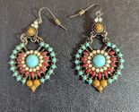 This product is a pair of handmade beaded fashion earrings featuring a metallic frame and a bohemian style. The earrings are round in shape, have a hook closure, and are multicolored with blue as the main stone color. They are from an unknown brand and are not vintage or signed. The earrings are perfect for those looking for a unique and personalized accessory to add to their jewelry collection.