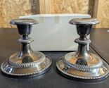 This product is a pair of M. H. Silver Plated Candle Holders, featuring a contemporary style and an elegant silver color. Measuring 4.5 inches in length and 4.25 inches in height, these small round candle holders are perfect for all occasions, including a wedding or any room decor. Made of silver plated material, these original candle holders from Hong Kong are a unique addition to any collection of decorative items.