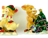 One deer is prancing on skis with a bag of presents at the side. One deer is decorating a Christmas tree. Approximately 3.5 in. Tall and 2.25 in. Wide. Good condition with some chipping, wear by the tails. See photos.
