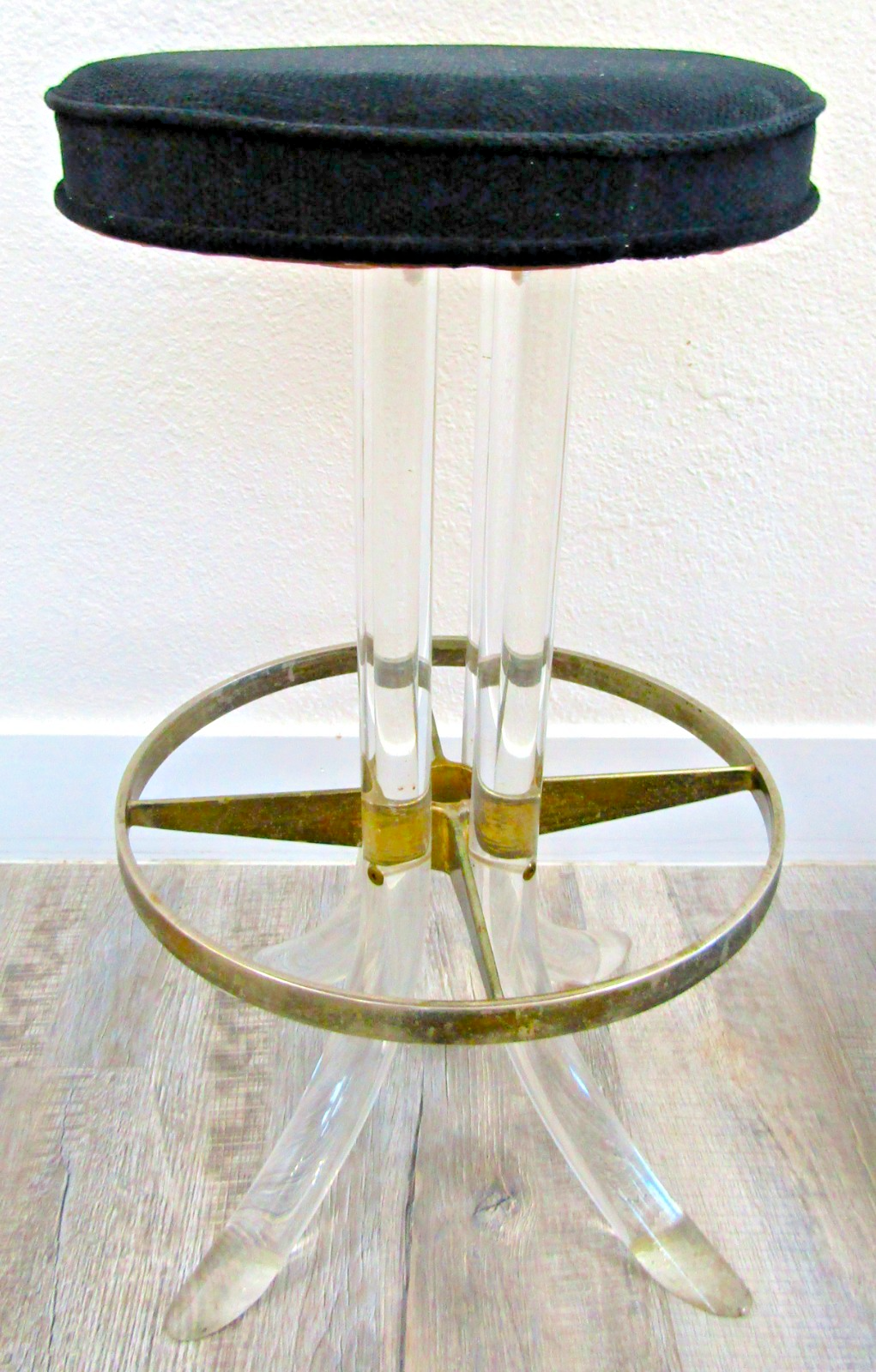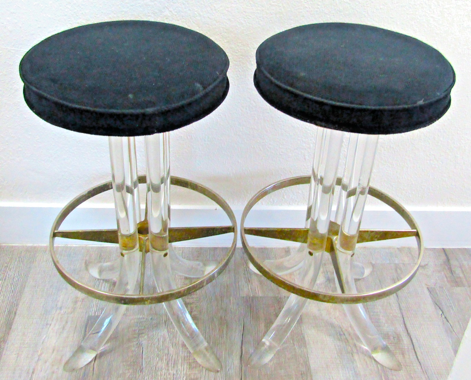 This product is a pair of vintage Hollywood Regency Lucite and Chrome Swivel Stools by Hill Manufacturing. These round, indoor bar stools feature a clear Lucite seat with a chrome finish, offering a retro and elegant look. The stools are fully assembled and weigh 23 lbs each, with a seat depth of 15.75 inches and a seat height of 28 inches. These original pieces from the post-1950 era are perfect for adding a touch of old Hollywood glamour to any room in your home. Pair of Hollywood Regency Swivel Lucite bar stools by Hill Manufacturing, 1970s, USA. Lucite Base with Metal Hoop Footrest with a Black Upholstered Seat. Manufacturers Label under the Seat.