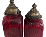Beautiful pair of decorative ruby red glass jars with ribbed sides and ornate bronze-style lids. Each jar features a rich, deep red color and detailed metal-look finial tops with an antique patina. Perfect for display, vanity storage, or adding a touch of vintage-inspired elegance to any space.