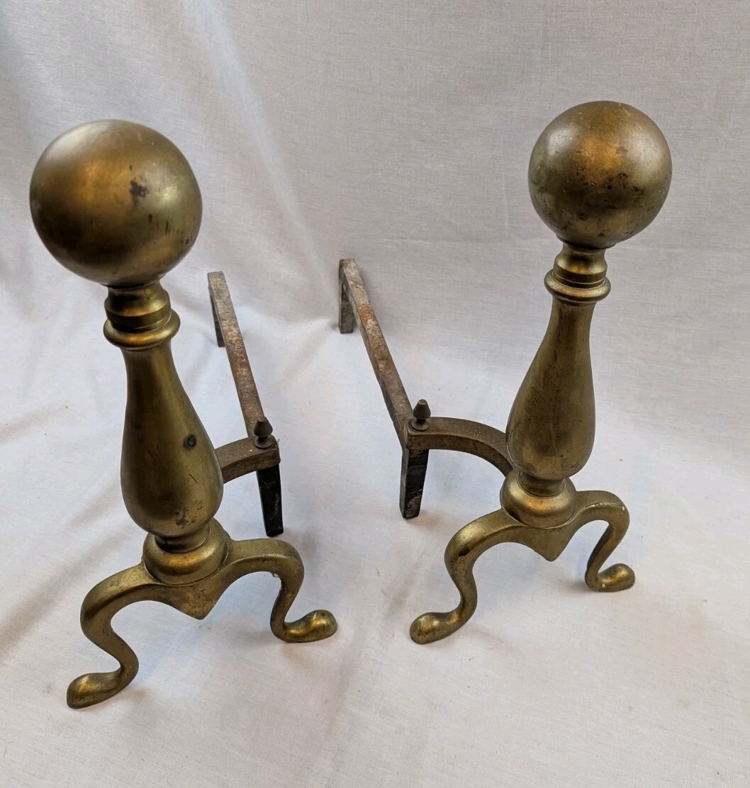 Up for sale is a Pair of Vintage Brass Cast Iron Ball Top Fireplace Andirons