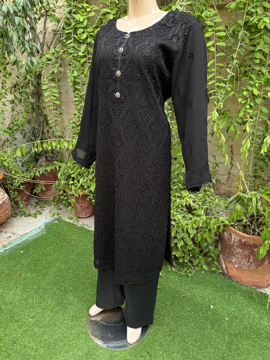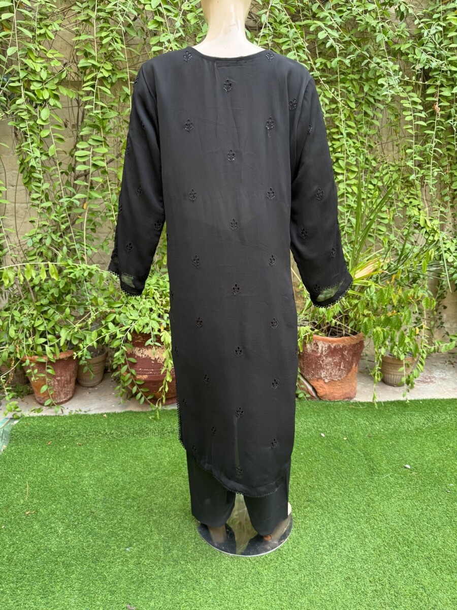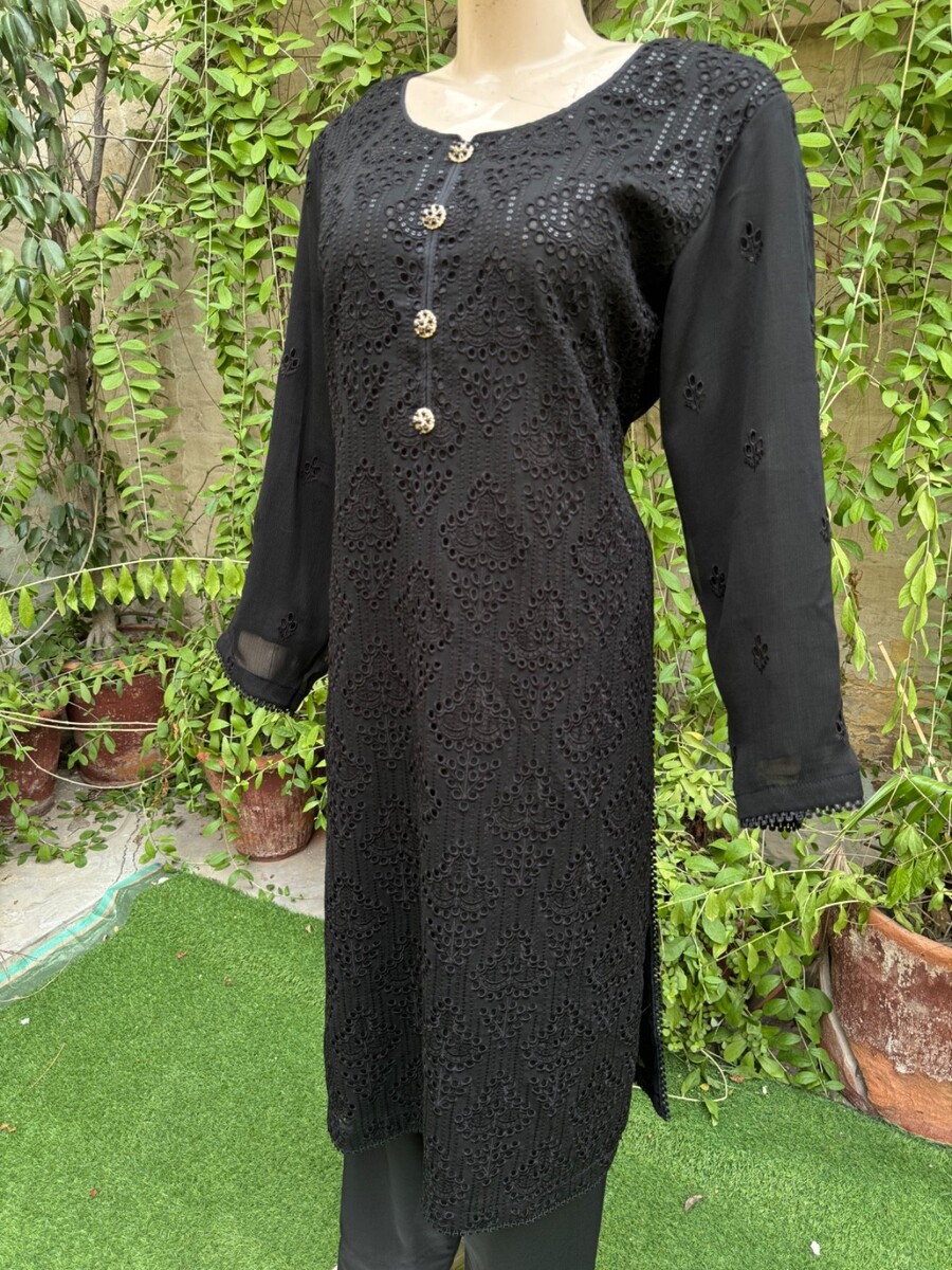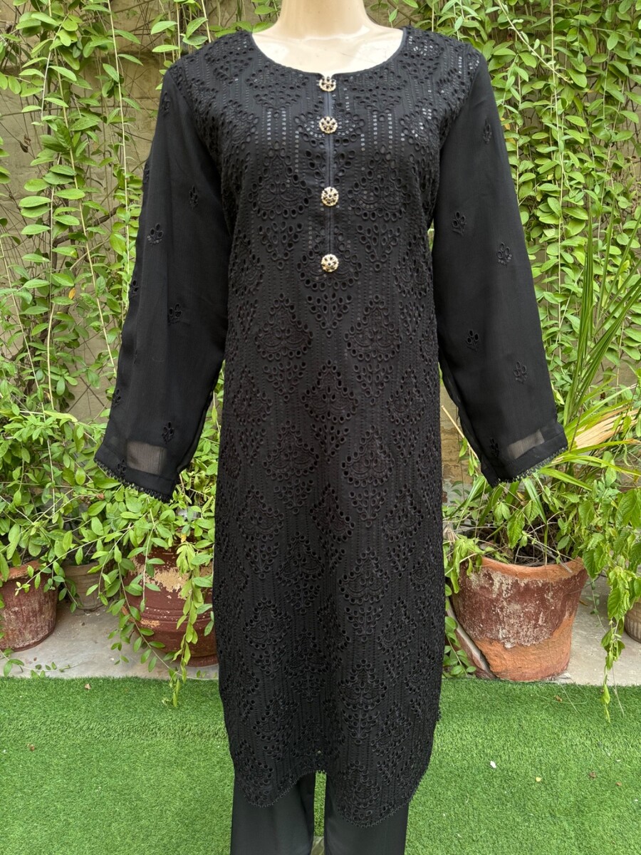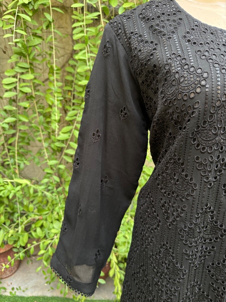 ? Black chiffon straight style shirt with boring chickankari embroidery ,embroidered shirt front and light embroidery at back.
