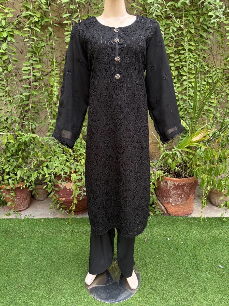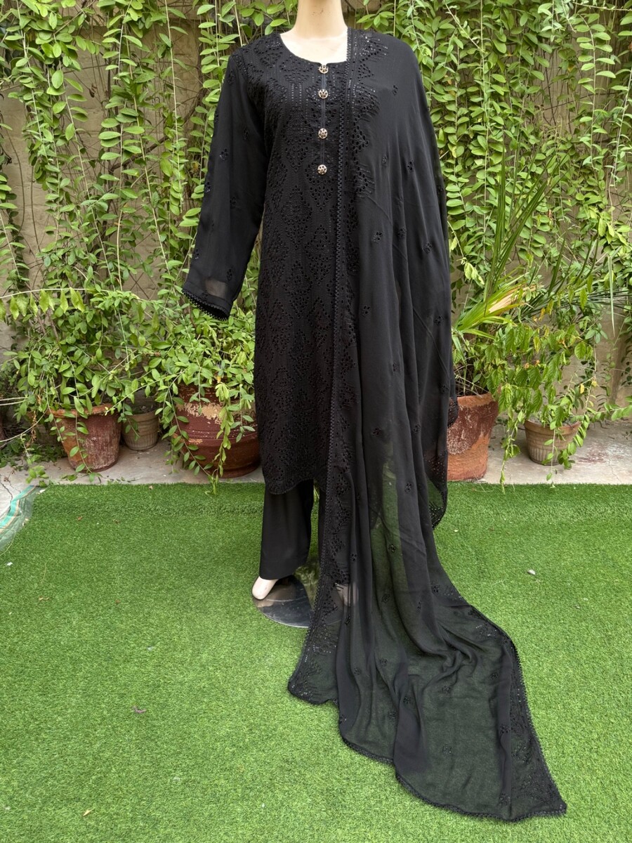 Pakistani Black 3 Pcs Fancy Chiffon Dress with thread embroidery ,XL