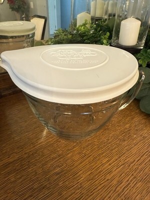 This bowl includes the original white plastic lid, which is still usable but slightly warped and does not click snugly into place. The glass bowl itself is in excellent condition ? clean, clear, and free of chips or cracks.