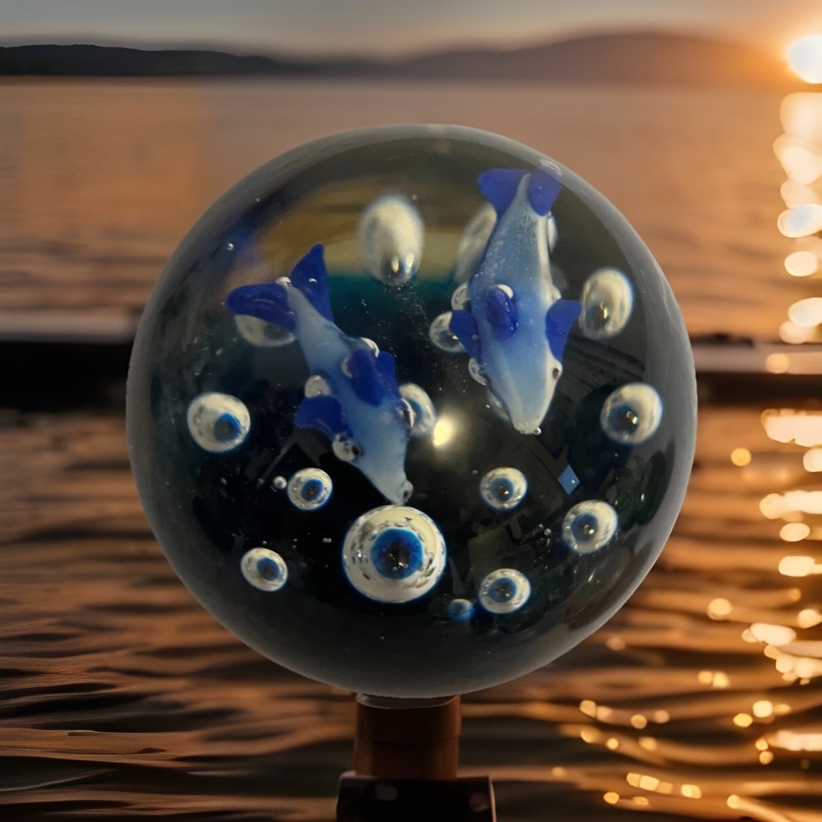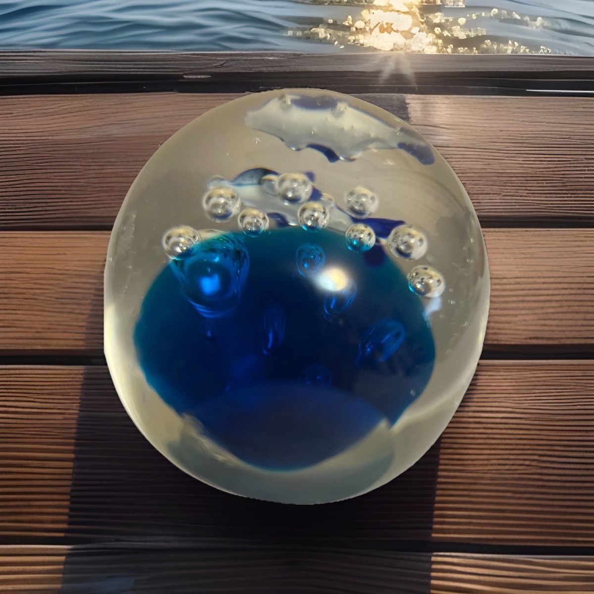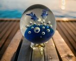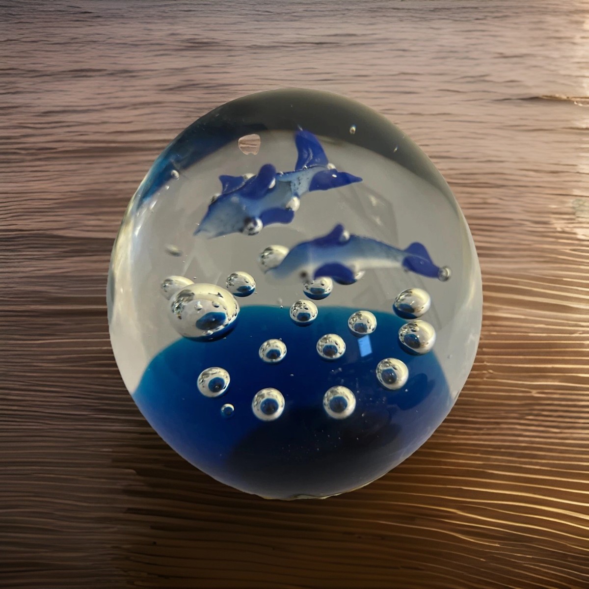 - Paperweight Clear Art Glass Ball Controlled Bubbles Blue Dolphins Ocean