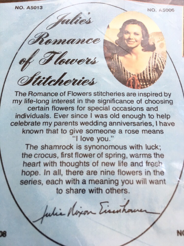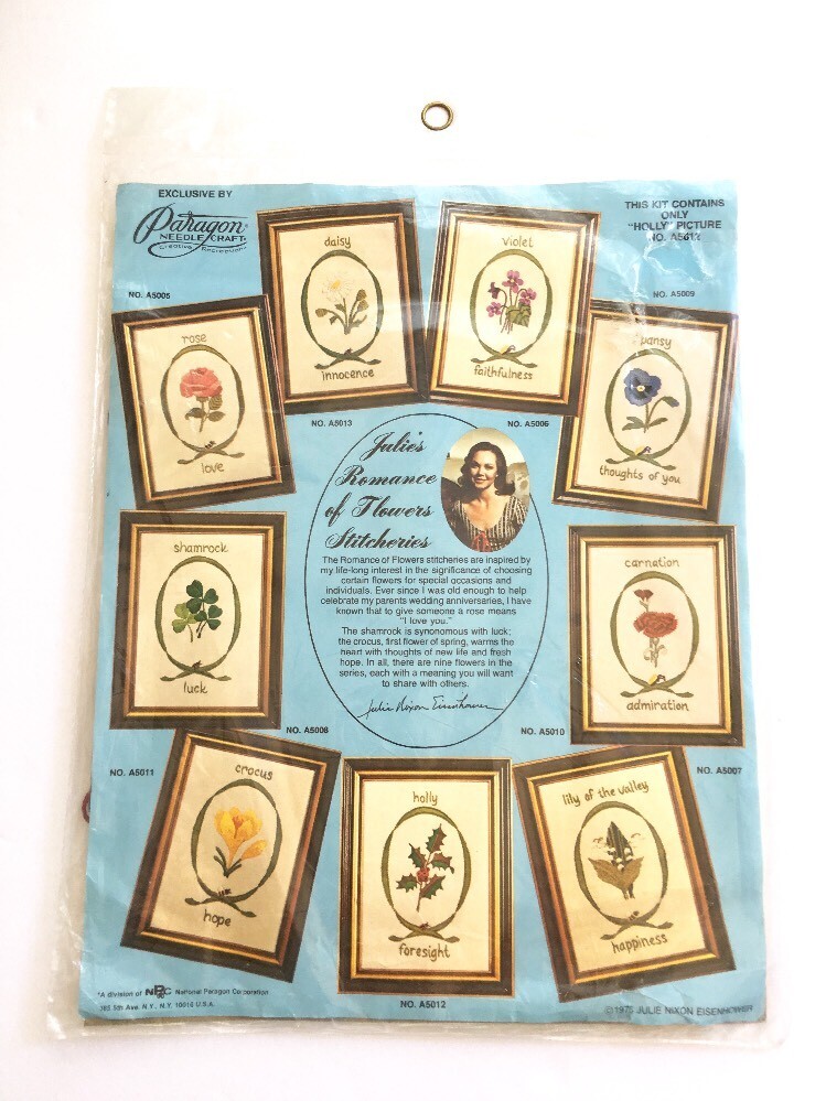 Designed by Julie Nixon Eisenhower as part of her Romance of Flowers Stitchery Series. This kit features an image of a holly berry framed in a ribbon with the word Foresight beneath. Colors include shades of green and red. Kit contains: Stamped picture on 100% linen. Peri-Lusta Filo (100% Cotton) embroidery thread. Needle and complete instructions with diagram. Designed to fit 5" x7" frame. Made in the USA .Vintage 1975. Please note, this is new old stock item. Vintage packaging is sealed but may shows wear (small holes, crinkles) or discoloration due to age, however, internal contents are complete.