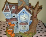 Has A Ghost Coming Out Front Upstairs Windows, Has Skelton In First Floor Window. Pumpkins By Front Door And Spider And Large Web. On Stones Going Up To Front Door Has Halloween Symbols Along With Smiley Faces. Next To House Is A Spooky Tree With Smiley Tree And Black Bat And Crow On Top Limbs. On Backside Of House Has Pumpkins Around Opening Where Tealight Goes In. Also Next To One Stack Ghost And Has Mummy. A Dog Has Has The Mummy Wrap In His Mouth. Has A Skelton Head On Ground On One Side. Has Cut Out Though Out House For Light To Shine Thru.