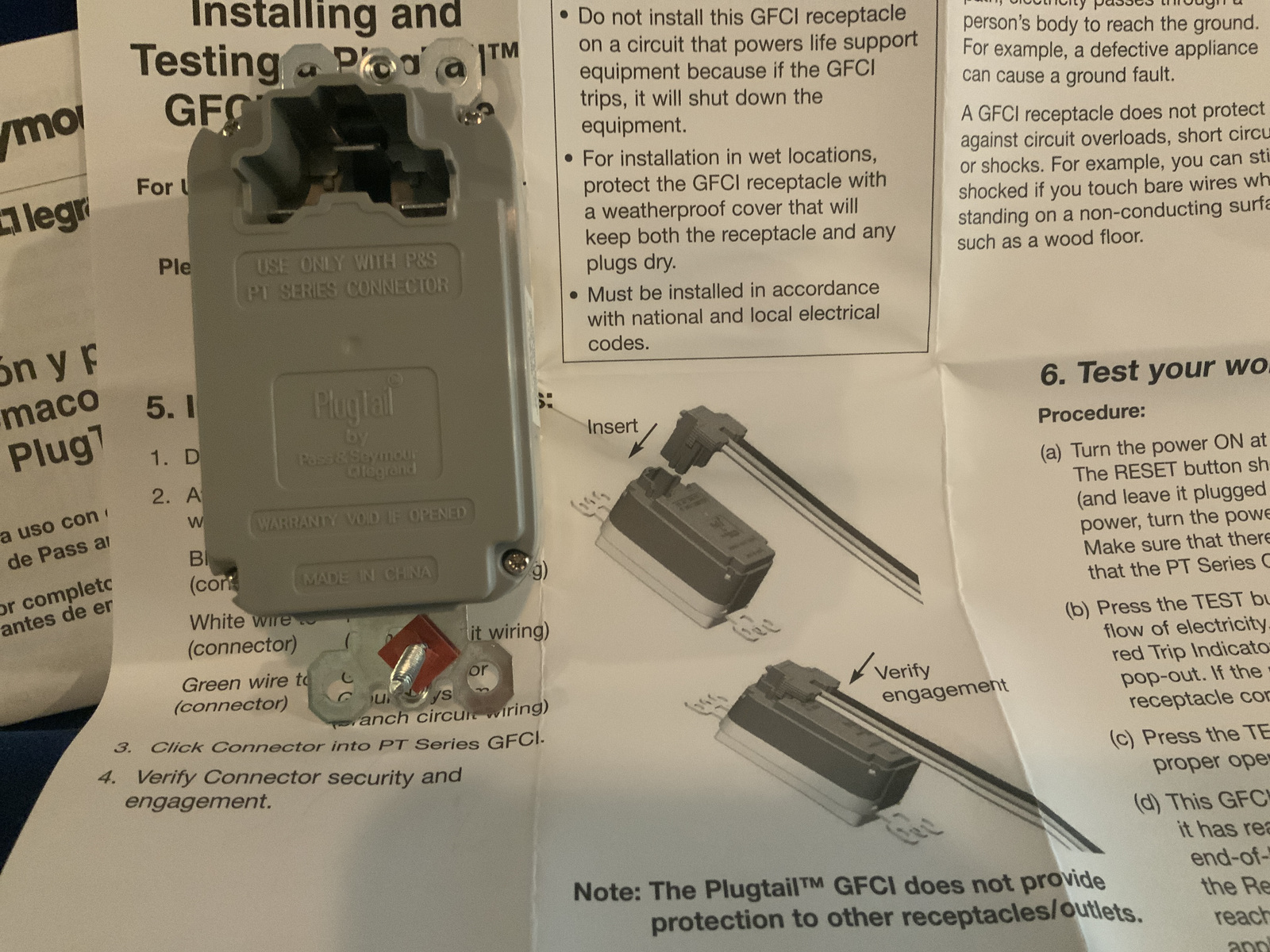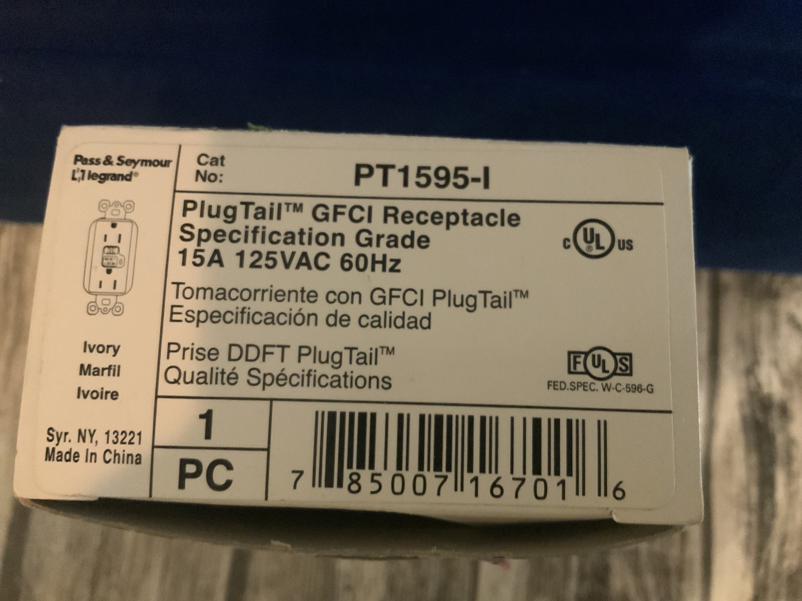 - Pass & Seymour PT1595-I, PLUG TAIL GFCI RECEPTACLE, UPC: 785007167016, 15A, 125V