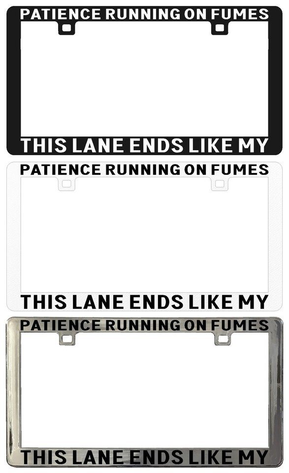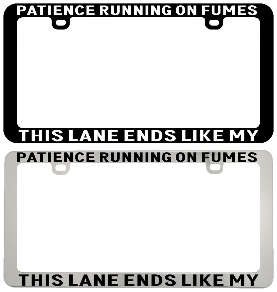 - PATIENCE RUNNING ON FUMES THIS LANE ENDS LIKE MY PATIENCE. License Plate Frame