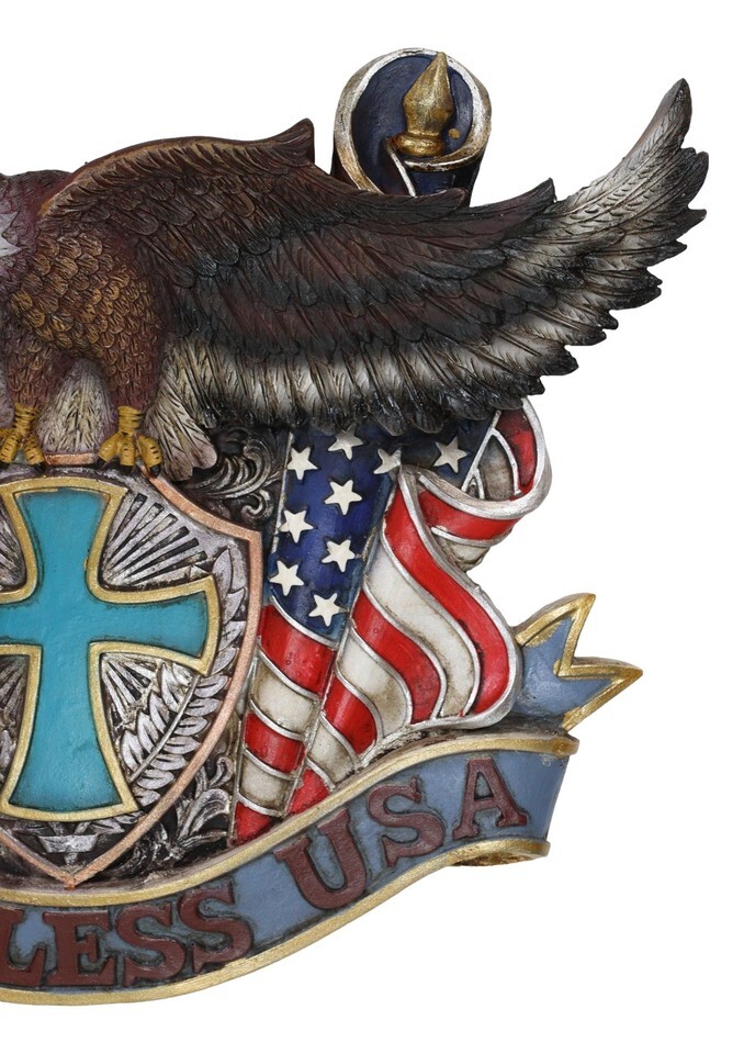 ? Following after the Great Seal of the USA, our bald eagle wall sculpture is both aesthetically impressive and symbolic. A bald eagle spreads out its wings while perching on a crest with a turquoise cross. 2 US flags flank the crest while the words God Bless USA is formed on a ribbon beneath it.