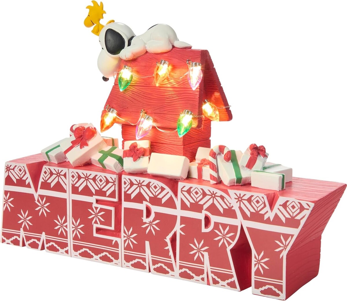 Snoopy helps you celebrate the season as no other beagle can. He and Woodstock enjoy his doghouse decorated with Christmas lights that really light up while surrounded by perfectly wrapped packages.