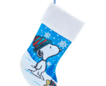 This Peanuts Snoopy and Woodstock stocking from Kurt Adler is a charming addition to any holiday decor. The stocking features Snoopy wearing a red and green Santa hat Woodstock. Set on a blue background with a winter scene and white plush cuff, this stocking is sure to become a fan favorite.