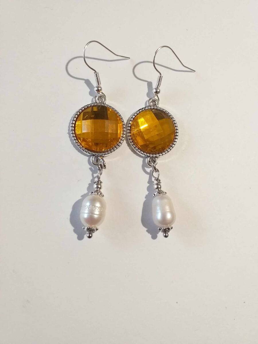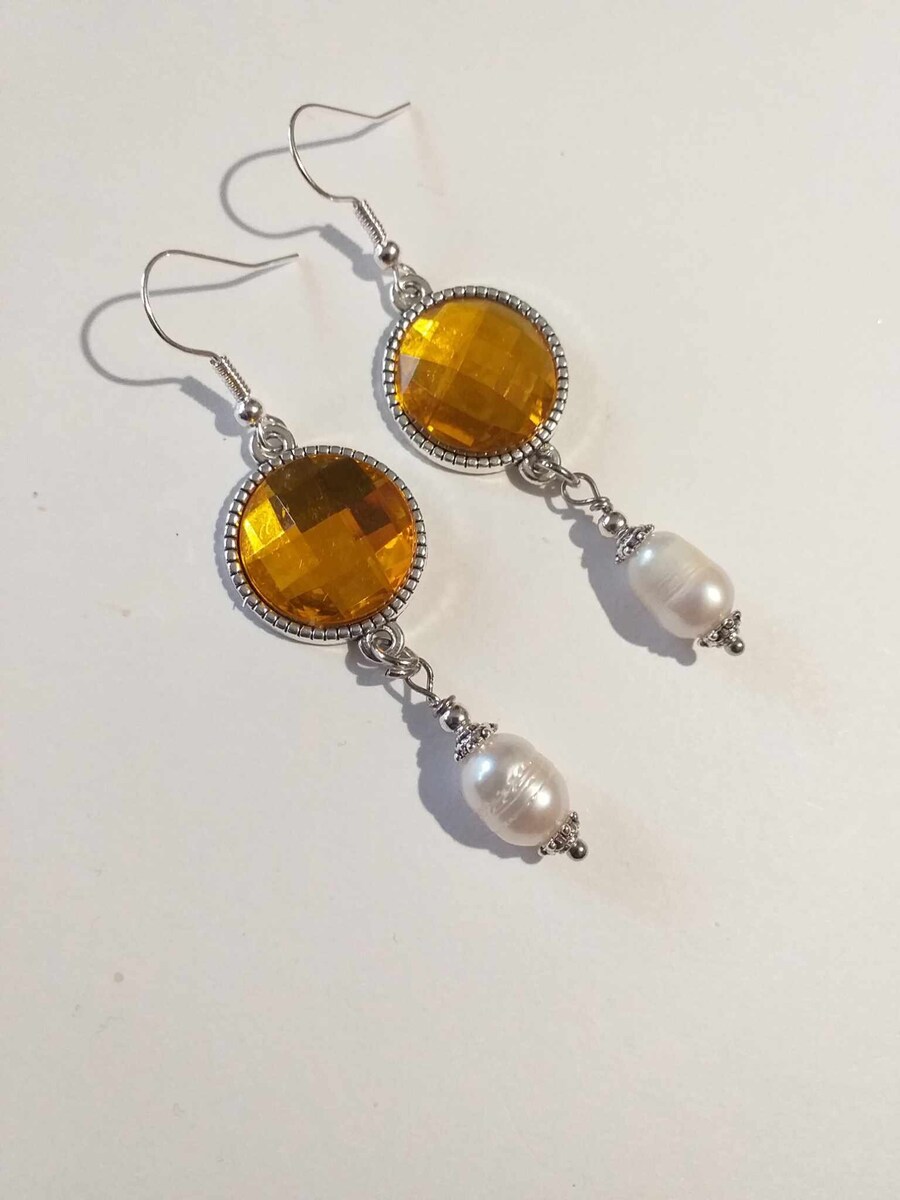 Material: genuine white pearls , silver toned metal ornaments ,yellow faux crystals acrylic cabochons 16 mm, silver tone chain.
