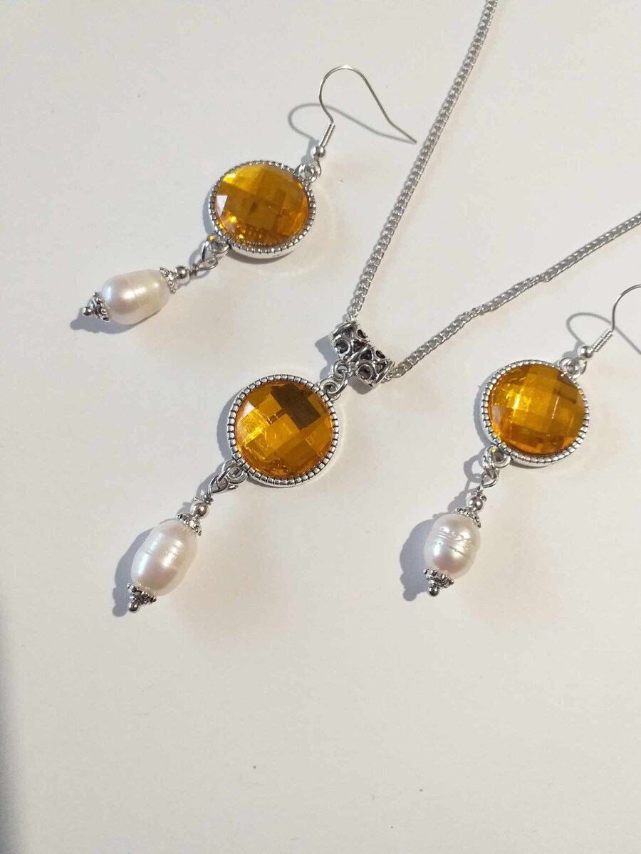 Beautiful Set of silver-tone Antique style yellow and fine white genuine pearls necklace and earrings. Silver tone Victorian style necklace and earrings. Boho necklace. Bohemian necklace and earrings. Romantic necklace and earrings. Beautiful necklace with same style earrings with white pearls and yellow faux crystals acrylic cabochons.