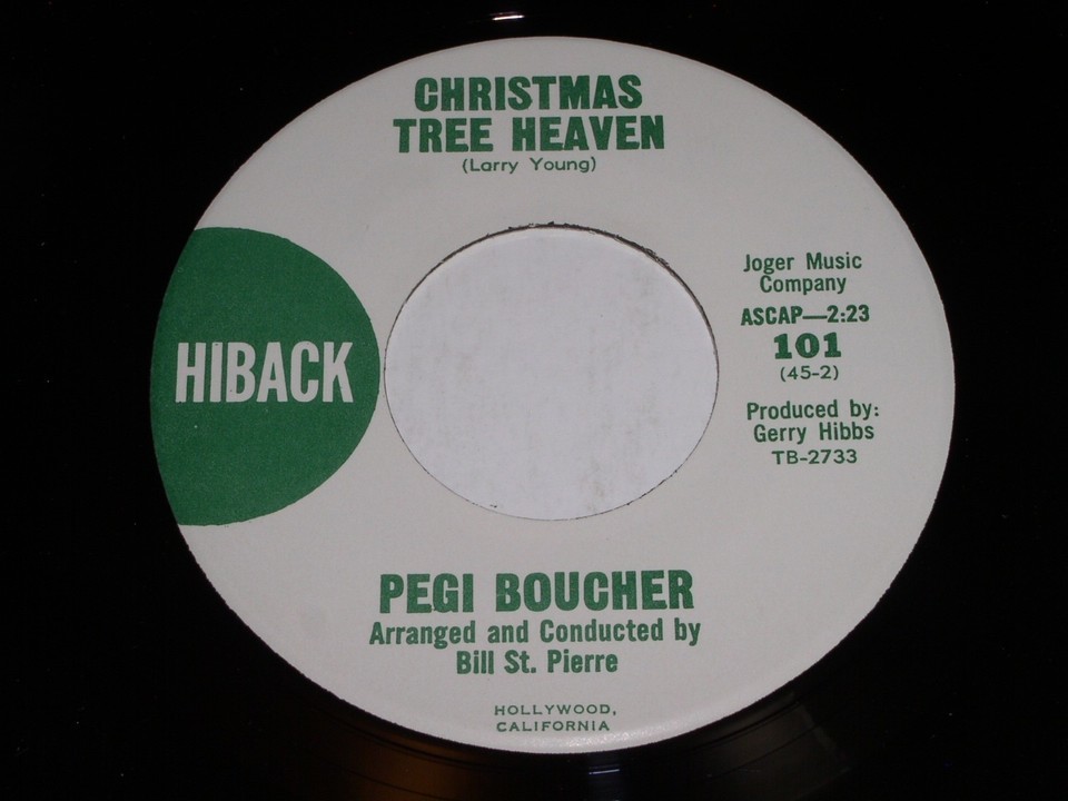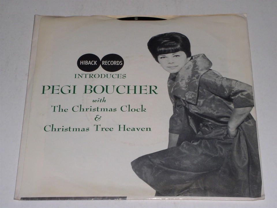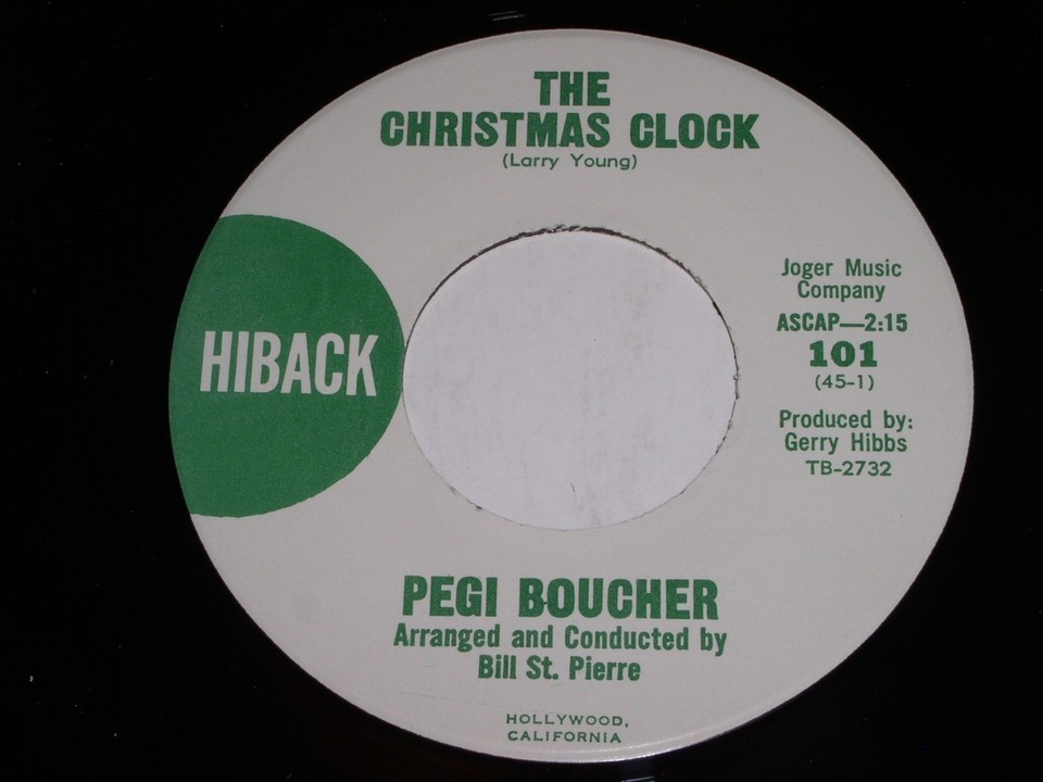 This is a vintage 45 rpm phonograph record by Pegi Boucher, entitled, "The Christmas Clock". Flipside: "Christmas Tree Heaven". Record label: Hiback 101.
