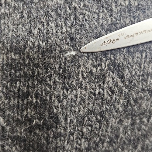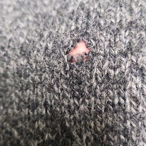 ONE HOLE (small but not unraveled. The right person could easily fix), see photos. No fuzzing/pilling. No stains or off odors.
