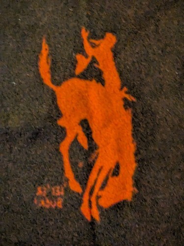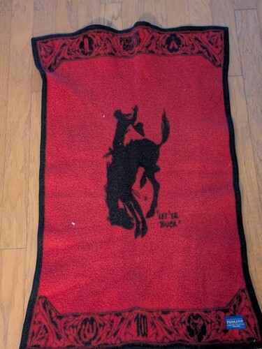 Una coperta di lana del centenario di 100 anni di Pendleton Let Er Buck Round Up in una forma rettangolare che misura 28 x 42 pollici. Presenta una combinazione di colori rosso e nero con un tema da cowboy occidentale. Realizzata negli Stati Uniti con materiale in lana, questa coperta originale di Pendleton e progettata per mostrare lo spirito del West americano.