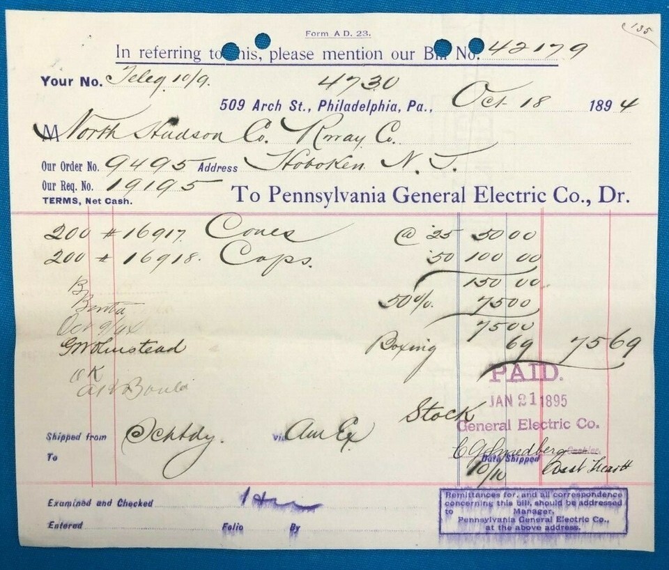 PENNSYLVANIA GENERAL ELECTRIC Phil vintage October 18 1894 invoice on letterhead