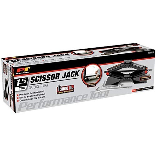 The Performance Tool W1600 1-1/2 Ton Scissor Jack has a 3,000-Pound load capacity and a lift range from 4 to 15-Inch. Its oversized base adds stability and support and has sturdy steel construction and precision threaded sha-Feet Its compact size will fit in trunk or truck.