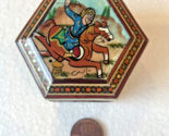 The product is a handmade Persian Khatam Mosaic Marquetry Wood Trinket Box with intricate hand-painted designs of a horse. Signed by the artist, this small trinket box showcases exquisite craftsmanship and attention to detail.