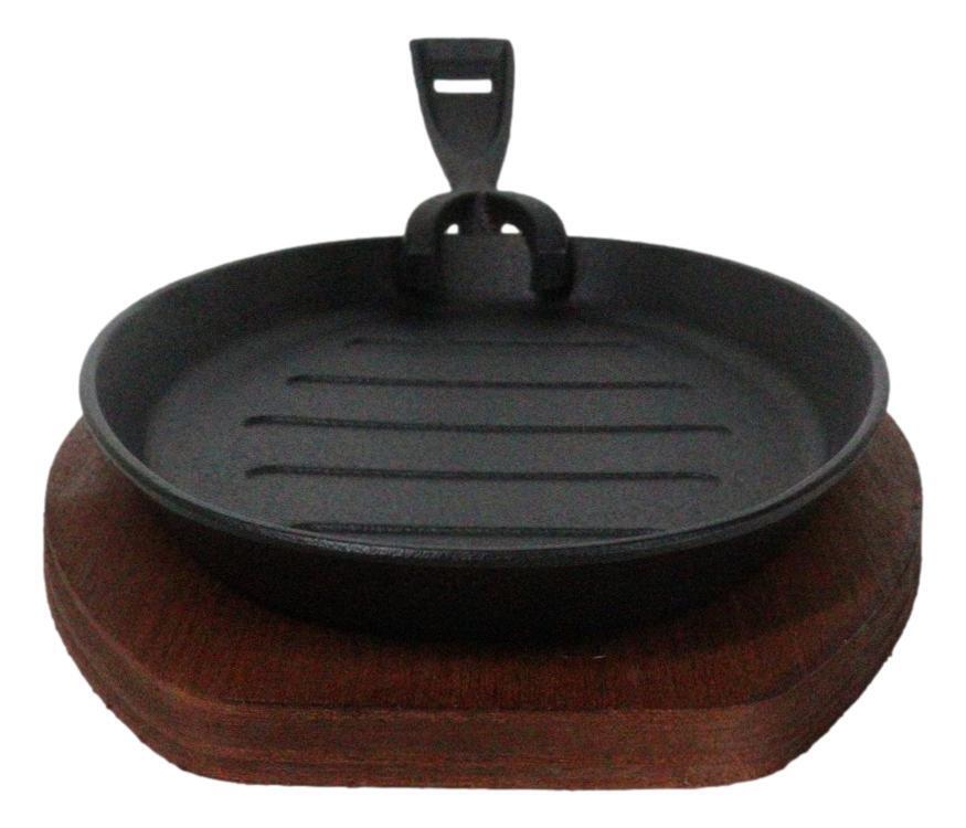 ? This Simple But Elegant Cast Iron Sizzling Plate is your best buddy to cook personal sized meats or vegetables. Cook with the sizzling plate on your stove then remove and put on the wooden base for serving. Serving your cooked food on this sizzling plate adds flavor and style to your secret recipe just like they do it in restaurants!