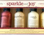 Brand new philosophy holiday gift set containing sealed full size tube of philosophy lip shine in Peppermint Bark, and 2oz mini shower gels in peppermint bark, gingerbread man, vanilla birthday cake, and candy cane.