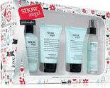 Brand new Philosophy large SNOW ANGEL scent holiday gift set containing all sealed 6 oz shower gel, 4 oz body lotion, 4 oz hand cream, and 4 oz body spritz.