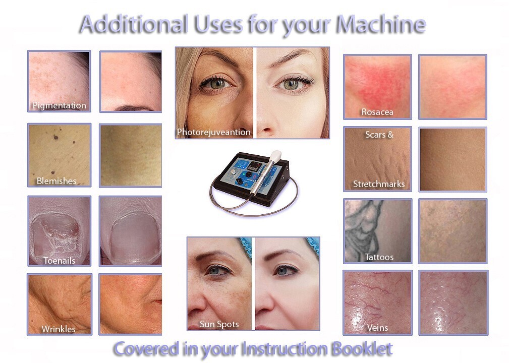 IPL is Also Approved For: Spider - Varicose Vein Reduction, Skin Toning, Body Sculpting, Photo Rejuvenation, Hyper Pigment - Age Spot Removal, Tattoo Removal, Wrinkle Reduction, Scar - Stretch Mark Reduction, Psoriasis, Rosacea, Sun Damage, Blemish (mole, wart, skin tag) Removal, Nail Fungus Treatment, and More. These treatment options are covered in the literature sent with the system.