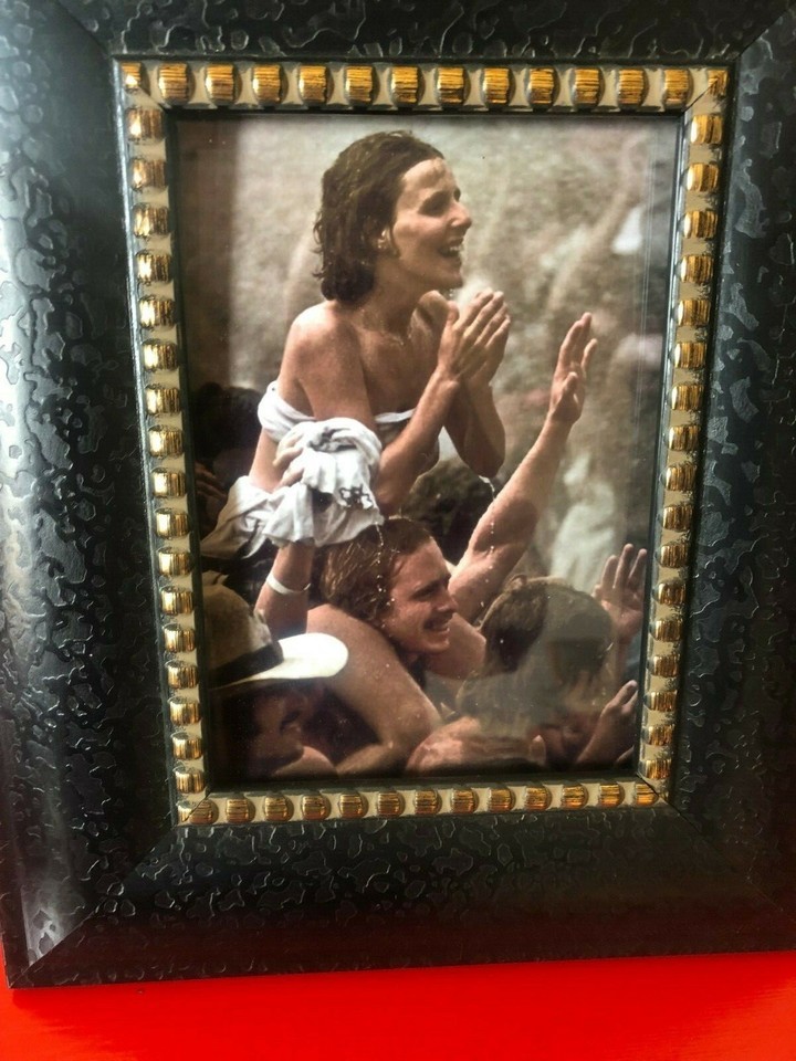 This is a photo infamous photo of a girl enjoying the first Woodstock of 1969 sitting on someones shoulders in the rain, framed in one of our rare vintage Black Frames with gold Edging. This photo is a 5x7, and the Frame does include the option of a kickstand, but does not have a hanging option.