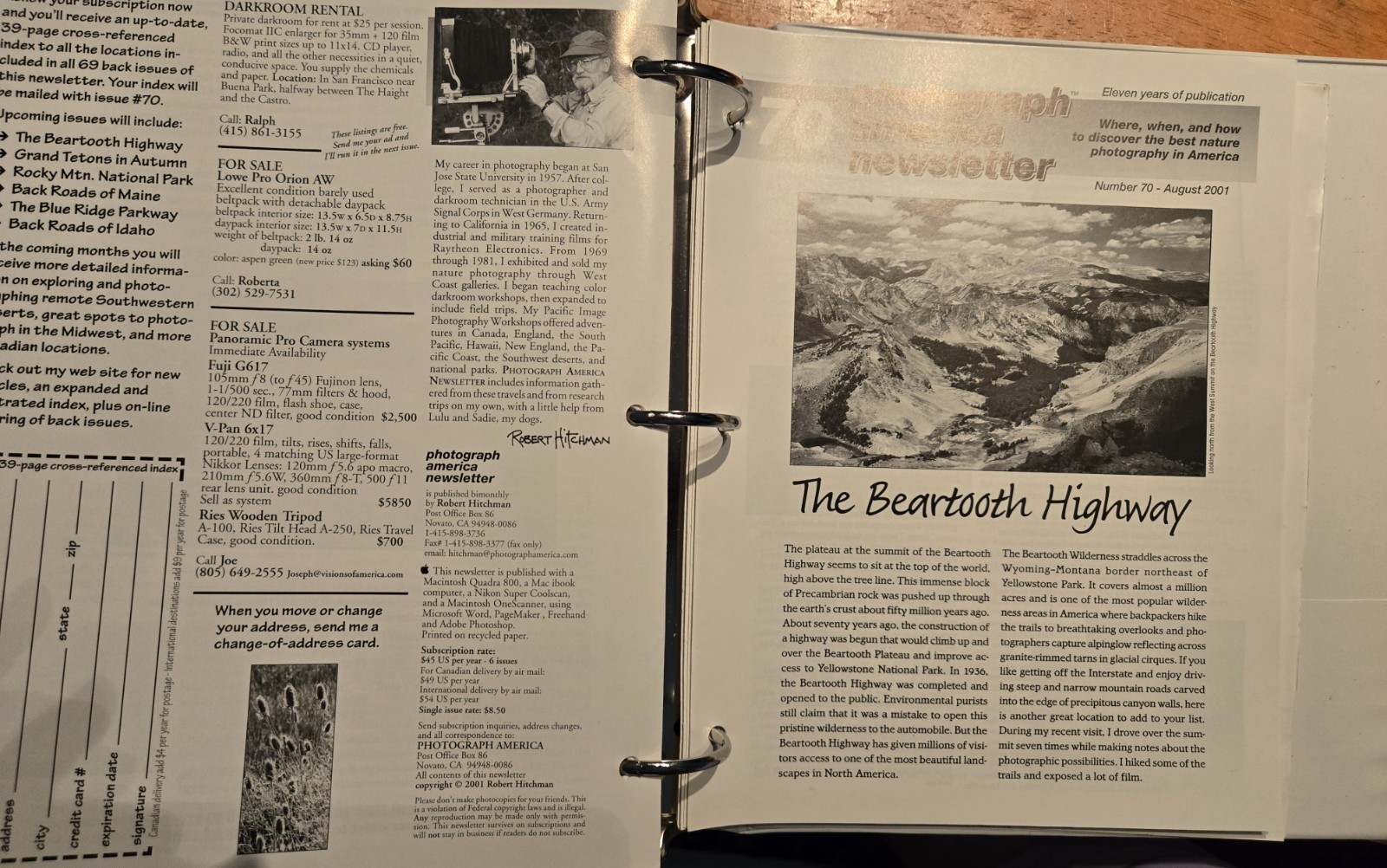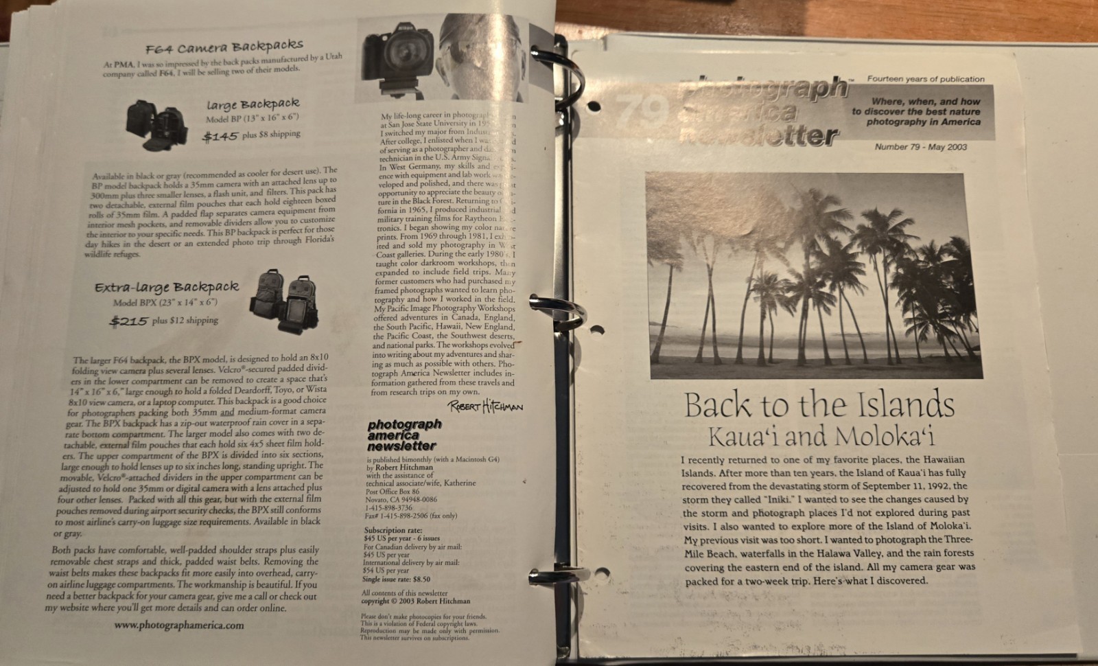 AThe product is a collection of 79 issues of the magazine "Photograph America Newsletter" from 1989 to 2003, focusing on travel photography guides by Robert Hitchman. The magazine provides a comprehensive exploration and documentation of various travel destinations through the lens of photography. Each issue features tips, techniques, and stories related to capturing the essence of different places and cultures. With a strong focus on photography and travel, this collection would be a valuable resource for photography enthusiasts and collectors interested in exploring the world through images.