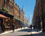 This is a digital painting of a bustling Victorian-era street in London. The cobblestone pathway is flanked by brick buildings with ornate facades, featuring large shop windows and awnings. People dressed in period attire, including top hats and long coats, stroll along the street. The background showcases iconic landmarks like Big Ben and the Houses of Parliament. The sky is a bright blue, and sunlight casts long shadows, enhancing the historical ambiance. The detailed textures and vibrant colors bring the scene to life. Image Size 3840 2560 Format JPEG