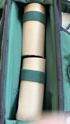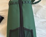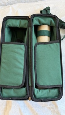 Brand new The Picnic Time Wine Carrier is a stylish and practical cooler tote perfect for all occasions. Made with padded polyester material in a green color, this carrier includes 2 glasses, a corkscrew, napkins, and stopper. It features an adjustable shoulder strap for easy transportation and insulation to keep your wine cool. With a compact design at 4 inches in depth and 10 inches in width, this picnic-themed carrier is a must-have accessory for any outdoor dining event.