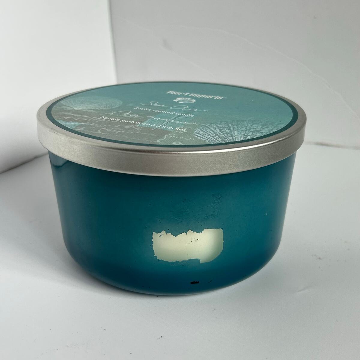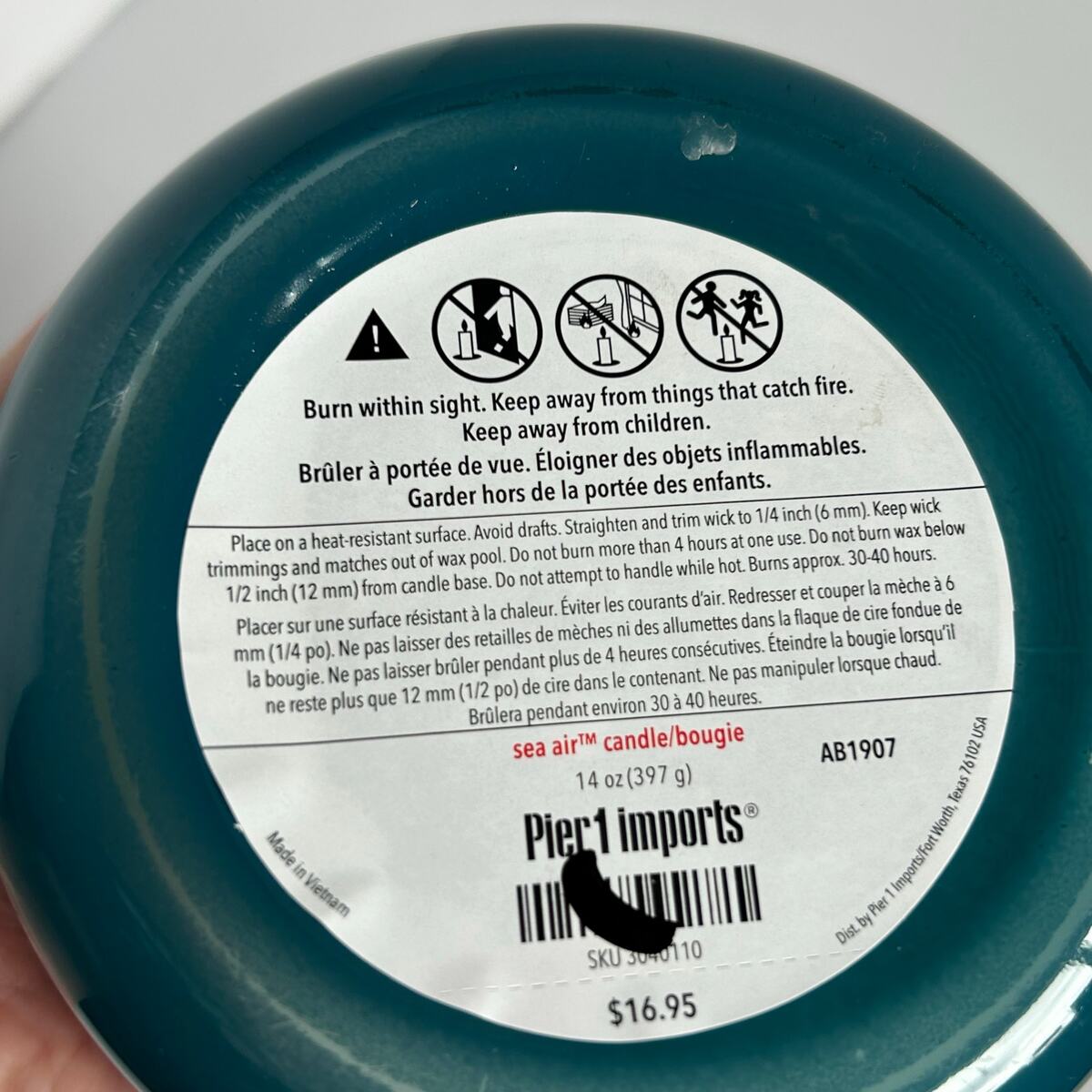 Discontinued Pier 1 Imports ?Sea Air? 3-wick candle in the 14 oz blue glass jar with original lid and label. Candle is new and unused, with wick unburned and clean wax. This is one of Pier 1?s most sought-after coastal fragrances, now completely discontinued.