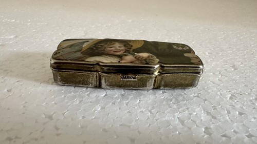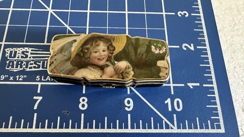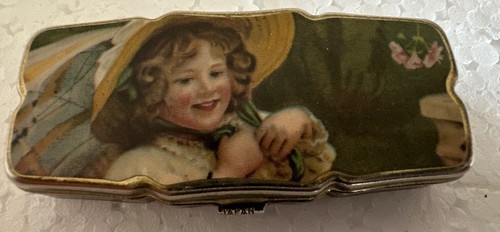 This vintage pill box features a charming girl in a hat design on the lid. Crafted from metal, the box measures 6.5cm in size and is colored gold. It is a perfect addition to any collection of boxes and trinkets, and is sure to catch the eye of a vanity or dresser. Made in Japan, this pill box is a unique and lovely piece that will add a touch of elegance to any room.