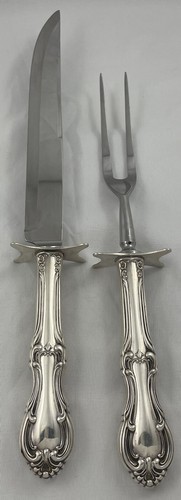 Sterling Silver TWO PIECE HOLLOW HANDLE WITH STAINLESS IMPLEMENT ROAST CARVING SET in the pattern PINE TREE BY INTERNATIONAL. It is NOT monogrammed and is in excellent condition.