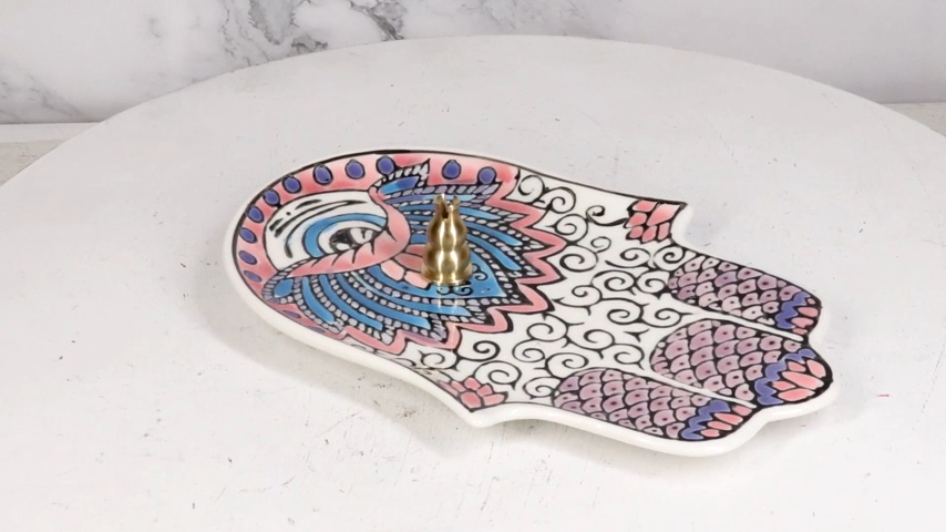 ? This Hamsa Palm With Eye Of Providence Incense Holder is made of ceramic, individually hand painted and polished.