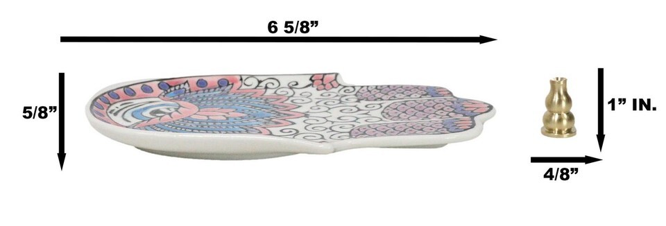 ? This Hamsa Palm With Eye Of Providence Incense Holder measures 0.75" High, 6.75" Wide and 4.5" Deep approximately. It weighs about 7 ounces.
