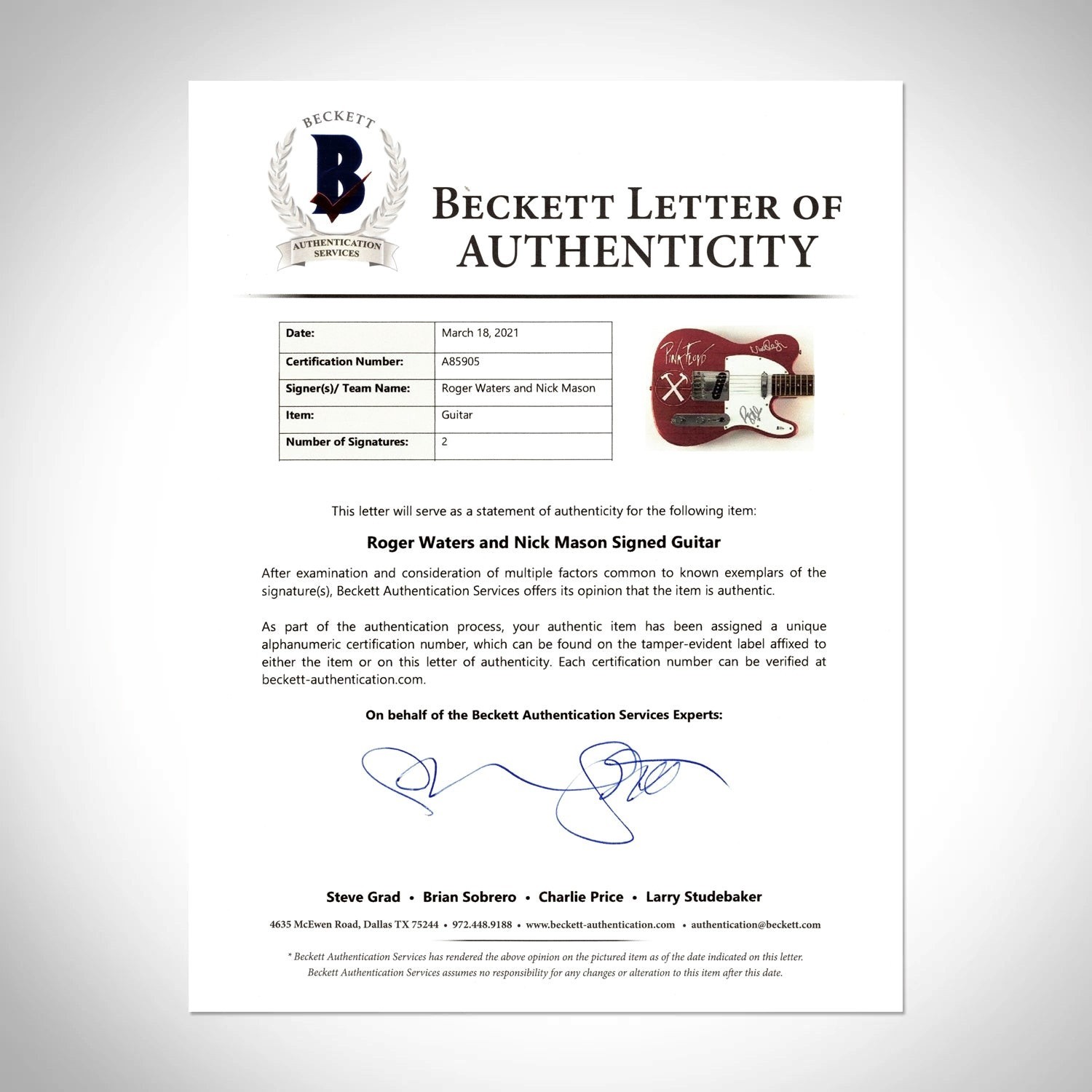 Pay homage to one of the most iconic Bands of all time Pink Floyd with this ABSOLUTE MASTERPIECE! A gallery-framed, BECKETT Authenticated, Fully Functional, Electric Guitar Hand-Signed by Roger Waters Nick Mason.