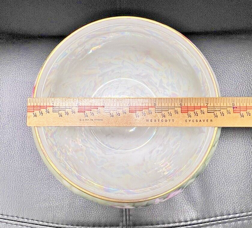 5 inches tall 7 3/4 across the widest part the top opening is 7.5 and the base is 4 3/4 Inches across