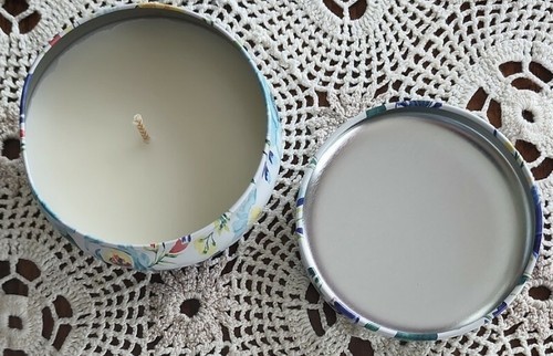 Candle tin measures approximately 3.5" diameter x 2.25" tall